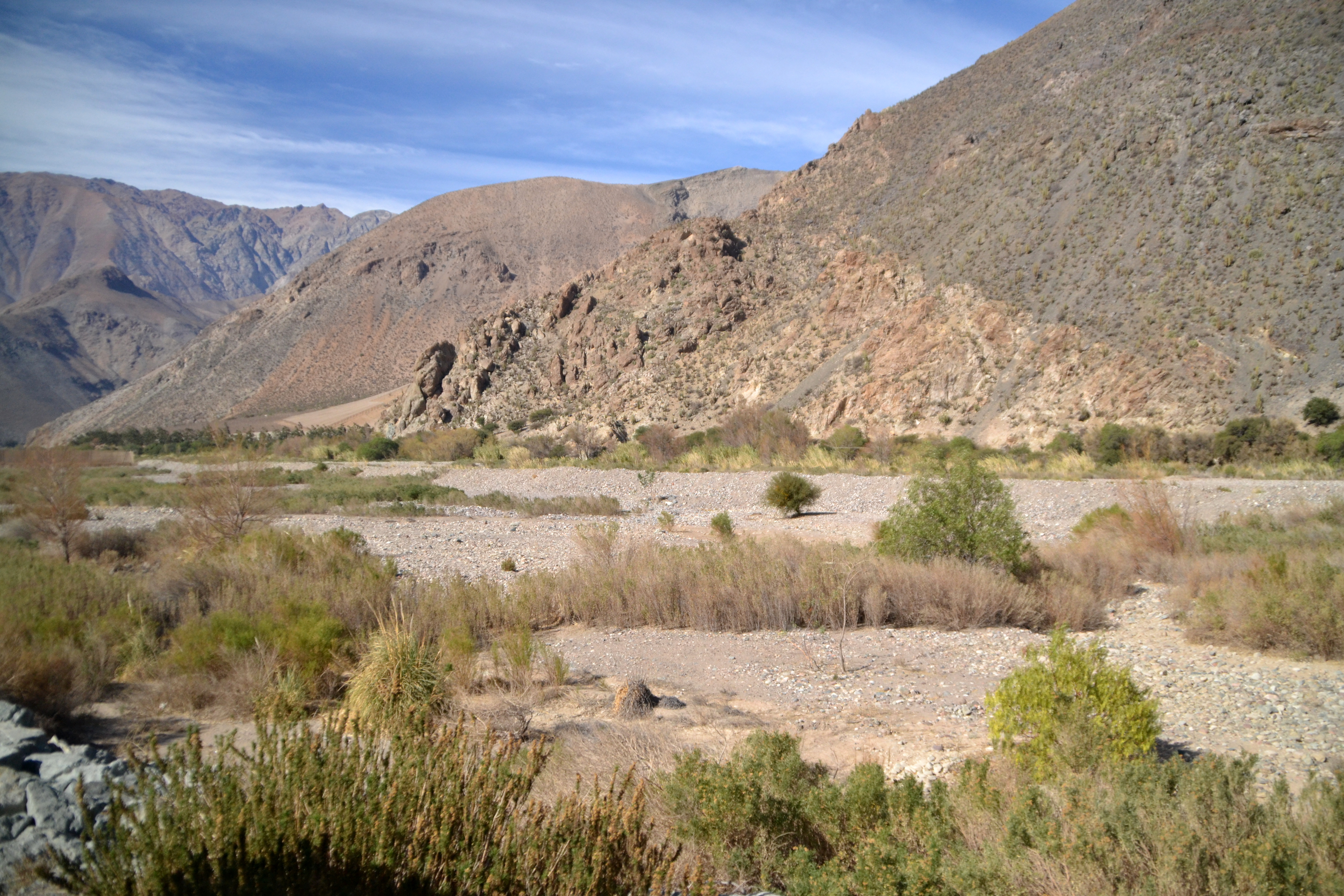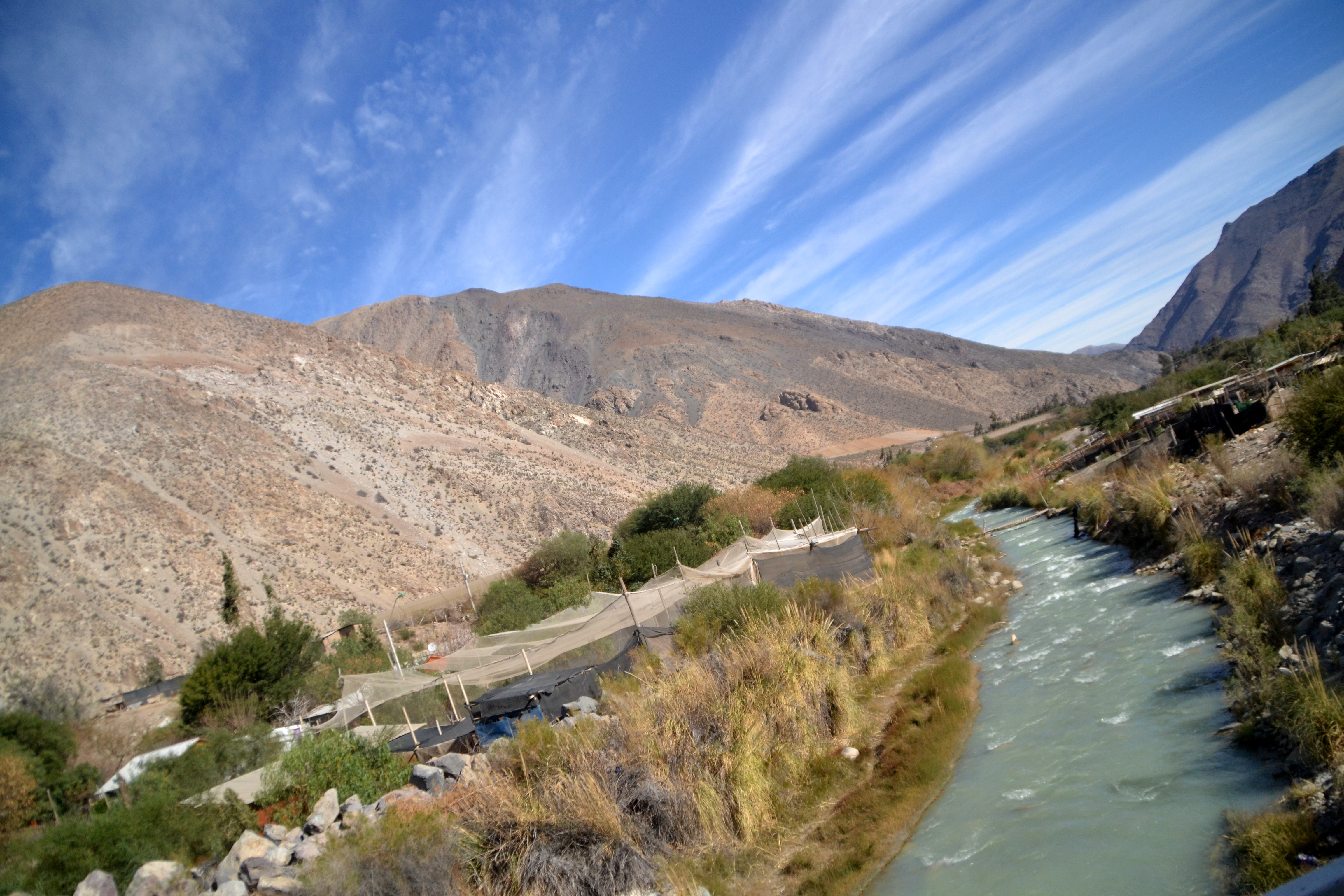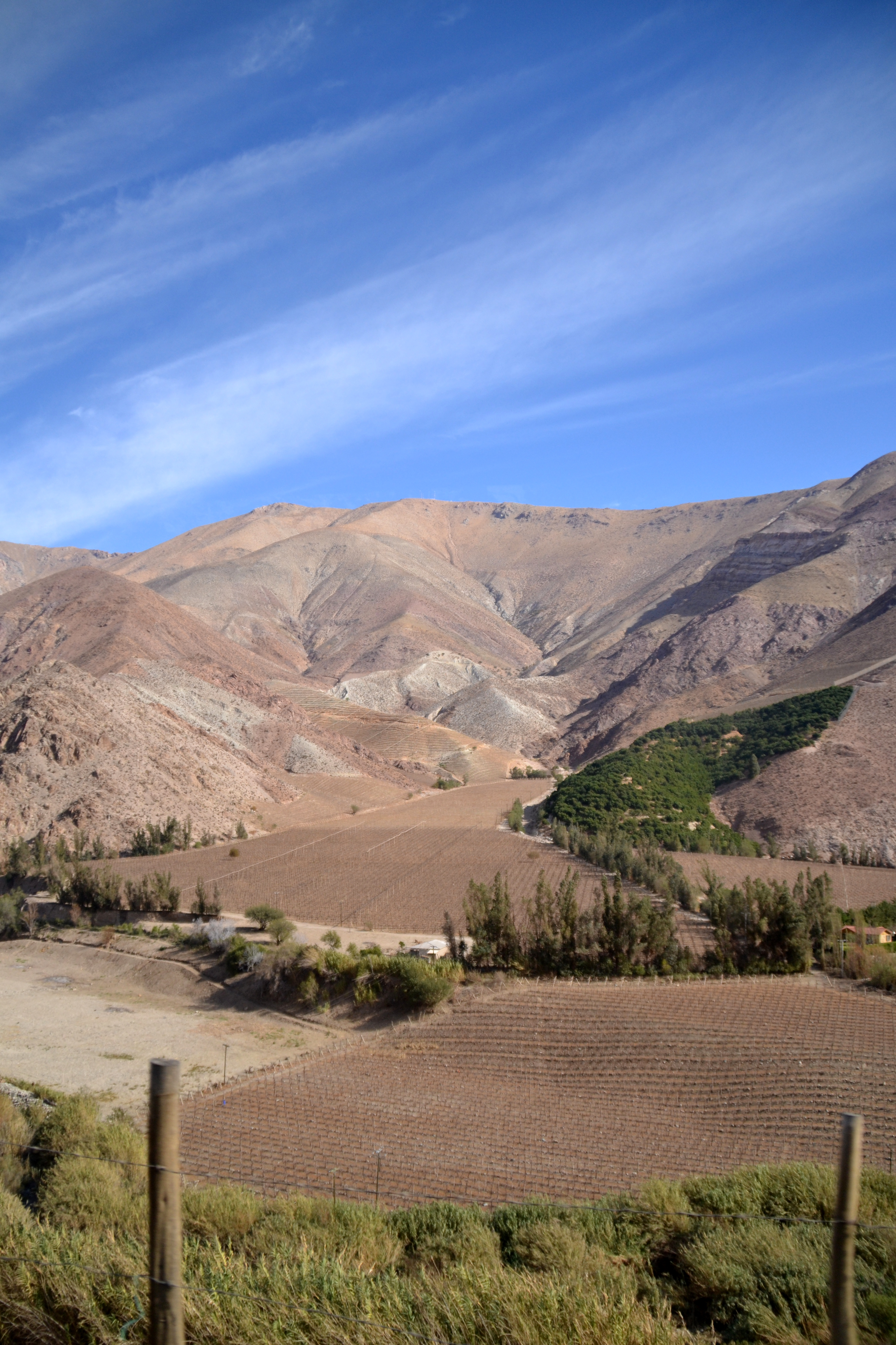 After checking out the museum we headed back to the bus terminal. I wish we could have  stayed longer in Vicuña, but we had to get going if we wanted to make it into the valley. The 30-minute ride to Pisco Elqui, a city in the valley, was absolutely stunning! It definitely made my top 5 favorite drives list (yes, I have a list). I had expected the valley to be vast: a huge chunk of land surrounded by soft hills. What I saw was pretty much the opposite. Elqui Valley is extremely narrow–if you don’t believe me, believe etymology: Elqui means “narrow” in Quechua–surrounded by rocky mountains.
